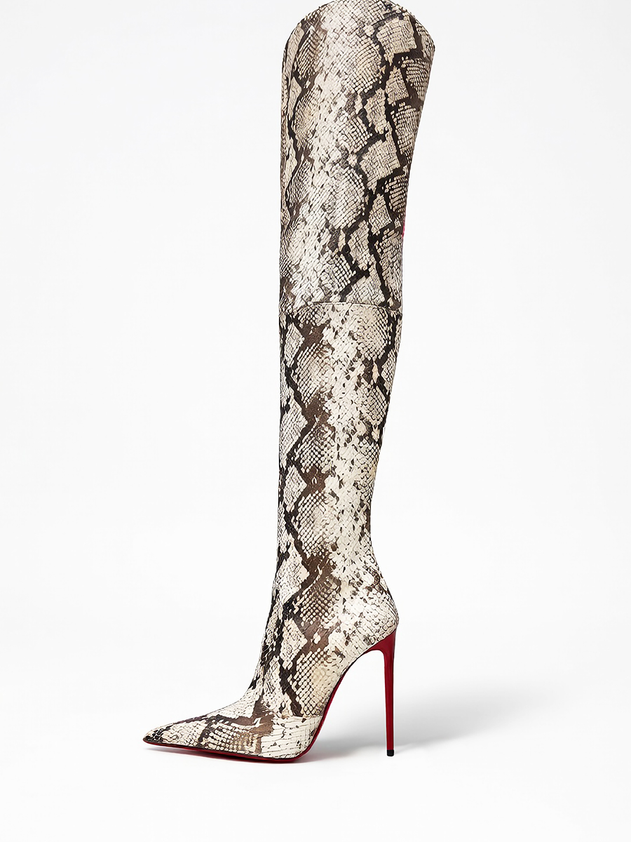 Moreover, mastering an extreme thigh-high silhouette in printed leather requires true architectural precision. A boot of this magnitude must maintain its structure while providing a flawless second-skin fit. Because of this necessity, we engineered the tall shaft to mold beautifully to your natural contours. This includes a reinforced interior structure that provides exceptional flexibility and long-lasting comfort. Furthermore, the lethal stiletto heel adds an elegant edge for a lasting impression. When you wear these python overknee boots, you experience the absolute zenith of Italian footwear craft.